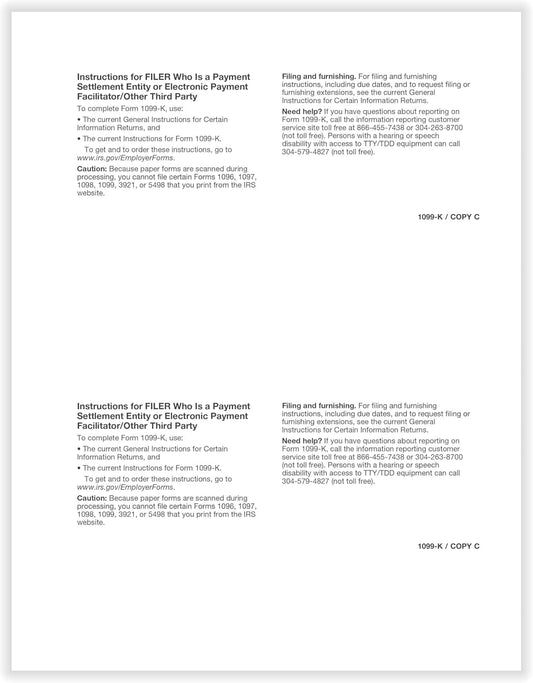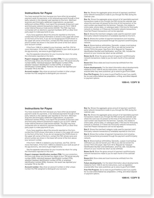 1099 K Payee Copy B Tax Forms, PSE File Form, Pack of 100 Forms (50 Sheets)