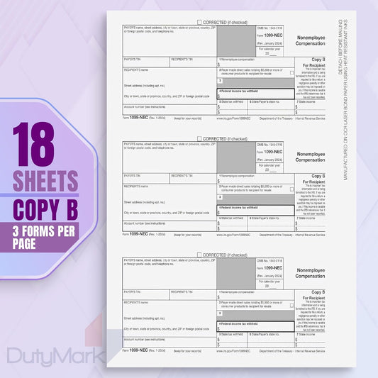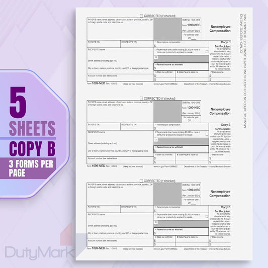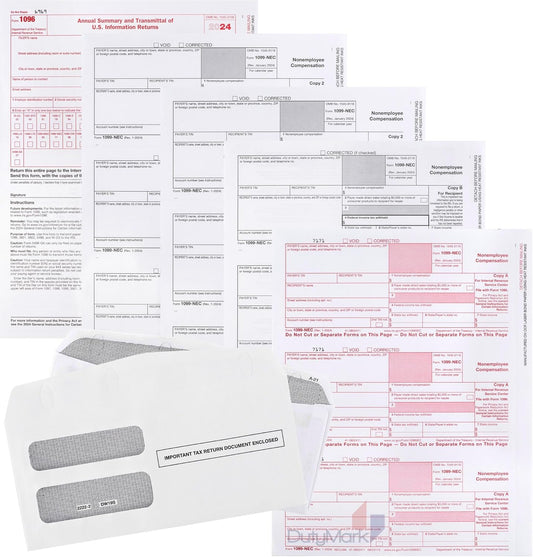 Dutymark 2024 1099-NEC Forms, 4 Part, 25 Pack with 1096 Forms & Envelopes