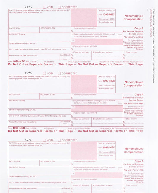 2024 1099-NEC Forms, 4 Part, 50 Pack with Envelopes
